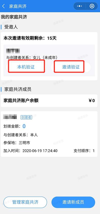 邀请验证:点击“邀请链接”→进入→同意加入→填写受邀人身份信息,输入划拨金额(也可直接跳过不划拨金额)→进行人脸识别→同意加入家庭共济。