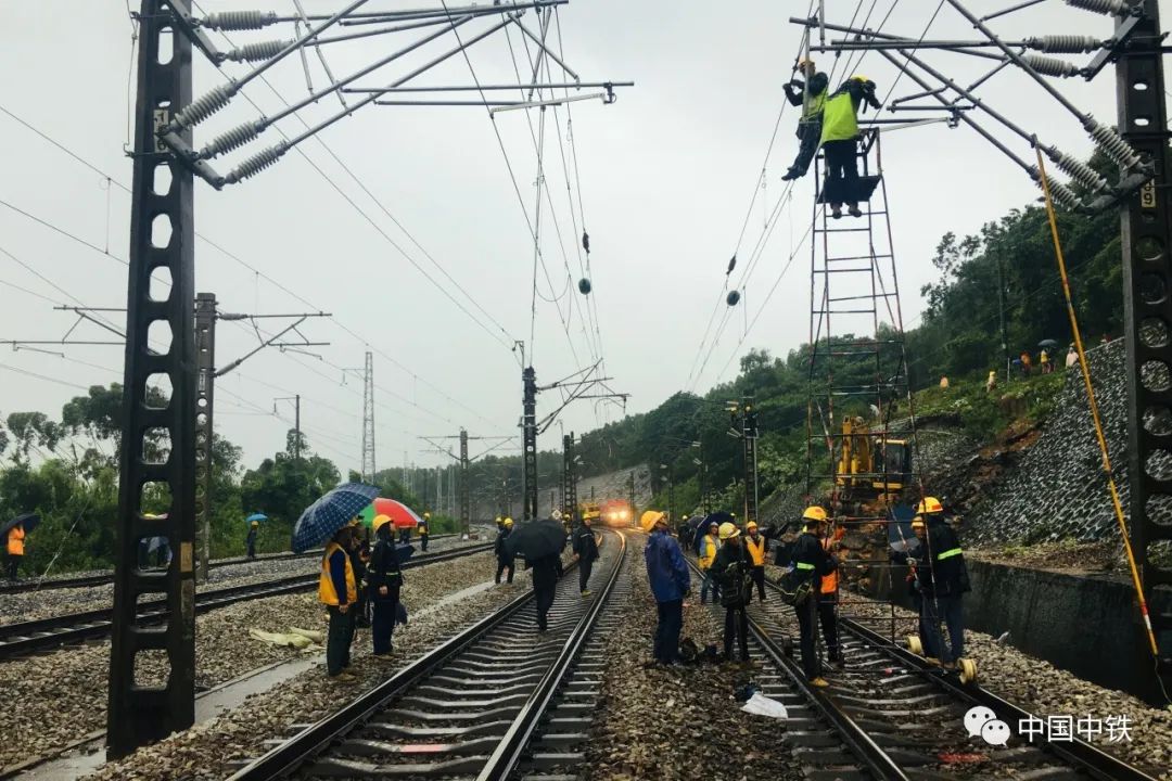 6月9日,受广东、湖南地区持续强降雨影响,京广线郴州、韶关、清远等区段降雨量超警戒值,铁路沿线山体滑坡导致边坡坍塌。当日10时,中铁六局接到紧急抢险通知后,立刻启动抢险救灾应急预案,仅用十分钟组织起69人的抢险队,冒着暴雨奔袭300公里,3小时内赶到抢险救灾现场。与此同时,10余台大型抢险设备通过公路发往事发现场。至当晚9时,抢险队先后完成现场积水排空、清表清淤、倒扶树木及路障清理、铁路片石清理、石卸车铺设等抢修任务,确保了铁路营业线的快速恢复。