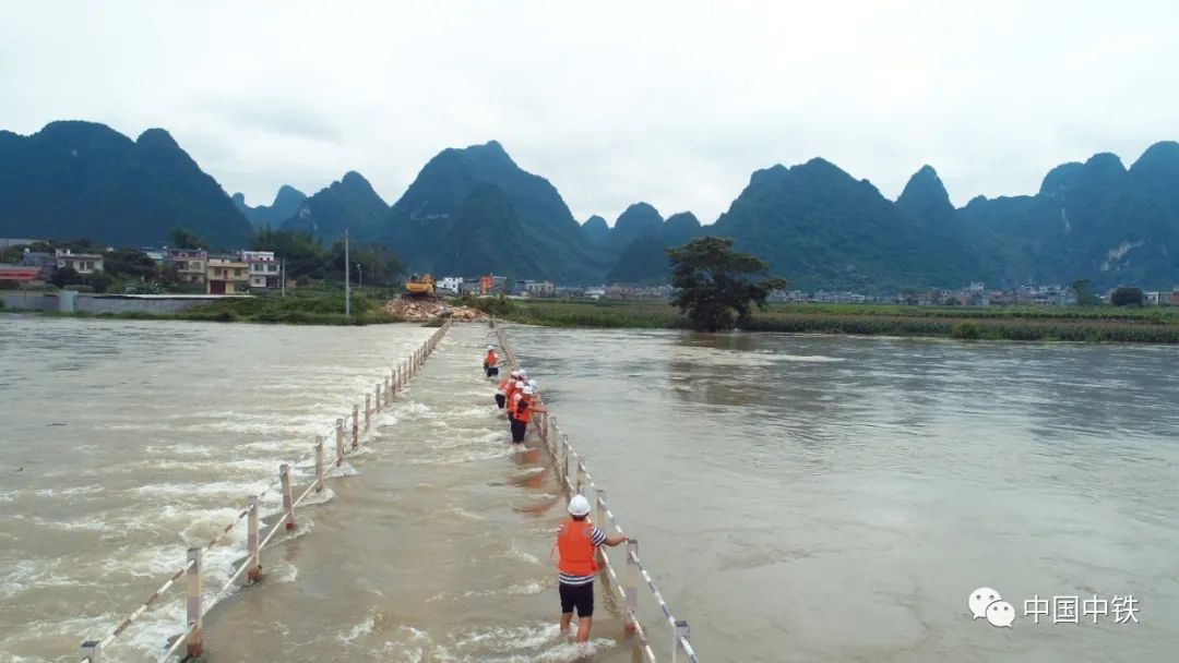 6月3日,骤降的暴雨造成广西河池市都安县澄江河水位上涨,河上的钢栈桥是中铁北京局贵南高铁项目部和周边几十户群众生产生活物资运输的主要通道,洪水淹没到了桥面,桥梁护栏随时会被冲毁。项目部第一时间启动防洪防汛应急预案,迅速到现场测水深、拉警戒带、设立警示标识牌、清掏便道护栏杂物、对线路和渠道检查疏通,确保桥梁通行安全。6月30日,浙江省兰溪市突降暴雨,当地一处教师宿舍东侧道路出现坍塌和积水,中铁北京局兰溪项目部立刻组织力量抢修,经过近7个小时的抢险,于7月1日17时清除路面积水,坍塌部位基本得到恢复。