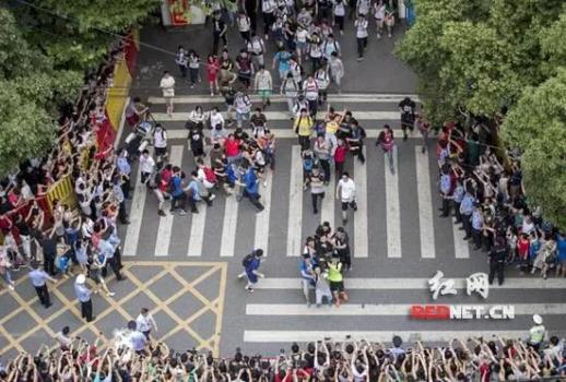 从这个号称“亚洲最大高考工厂”的学校驶出。送考车的车头车尾都坐着穿红衣服的学生,有学生打开车窗,喊着毛中必胜,