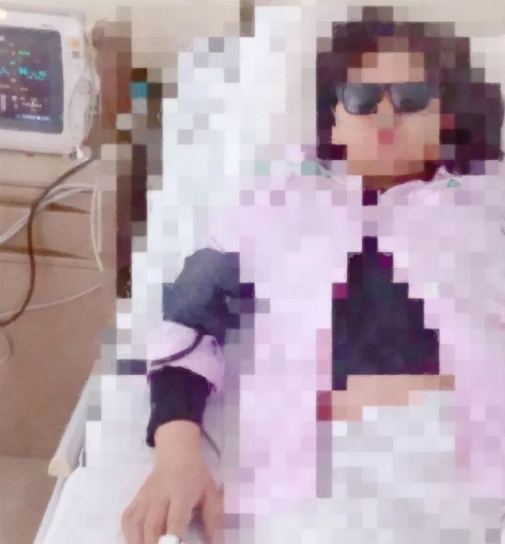 左手持续十几个小时吊着硫酸镁,墨镜是为了减少光线照射眼睛使颅内血压升高,避免引起子痫,硫酸镁是控制血压的,但对心脏不好。
