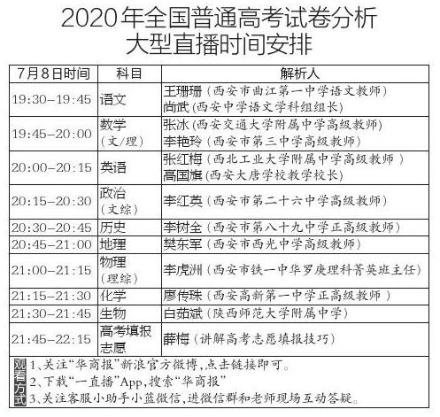 7月8日晚,华商传媒集团主办,《华商报》社、二三里资讯承办,西安明德理工学院冠名,联想支持的“2020年全国普通高考试卷分析大型直播活动”将再次如约开启。届时,来自西北工业大学附属中学、西安市铁一中、西安高新第一中学、西安交通大学附属中学、陕西师范大学附属中学、西安市第三中学、西安市第二十六中学、陕西省西安中学、西安市第八十九中学、西安市曲江第一中学、西安市西光中学、西安大唐学校等知名中学的名师将走进华商直播间,这些老师在高考后第一时间进行2020年高考试卷各科目点评,现场指导全省30多万考生估分,并指出明年高考复习重点和提高方向。另外,还邀请高考填报志愿专家薛梅老师加盟高考直播活动,将会以丰富的案例向家长和考生介绍高考报考的政策以及填报志愿的技巧。