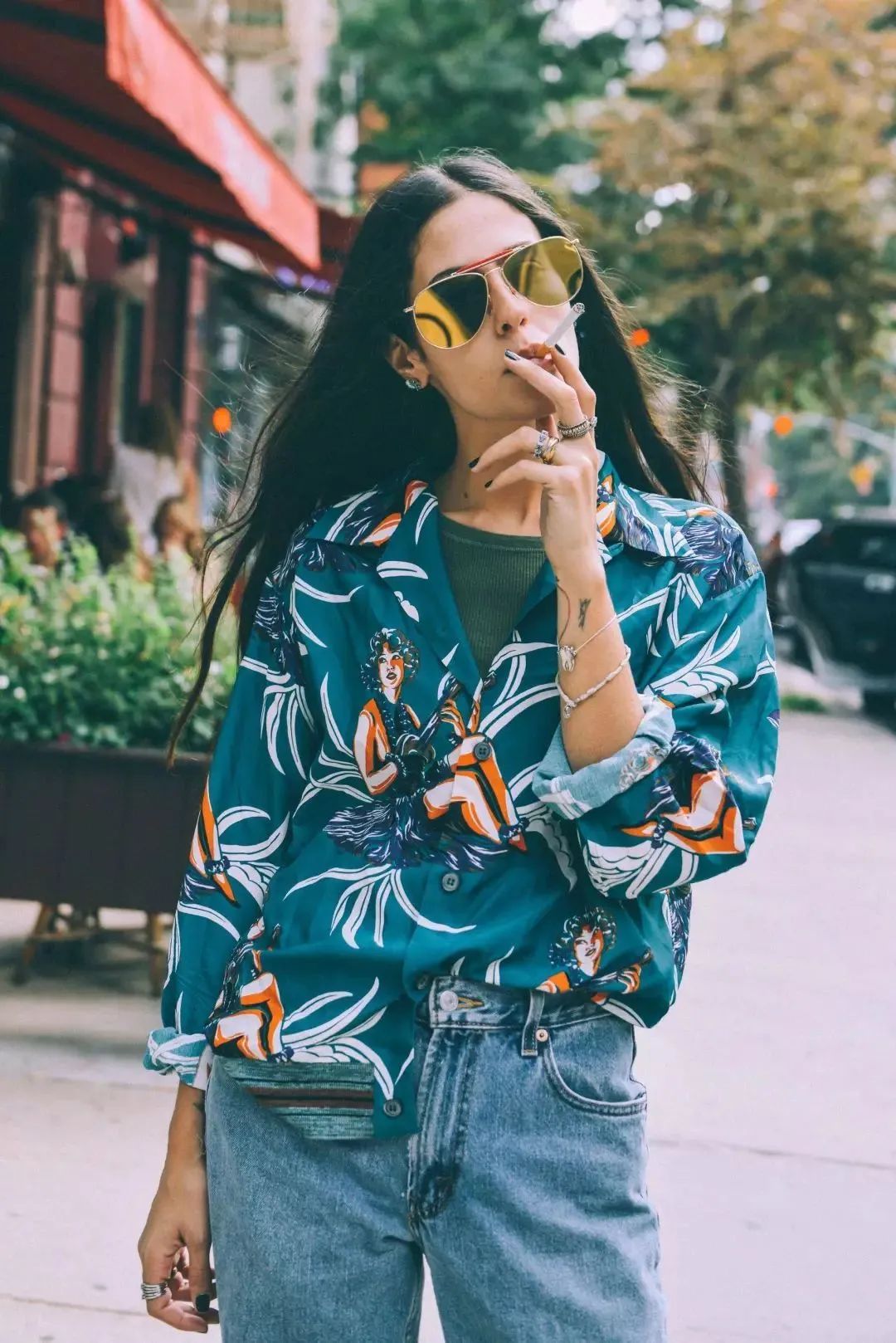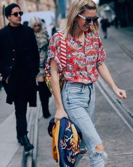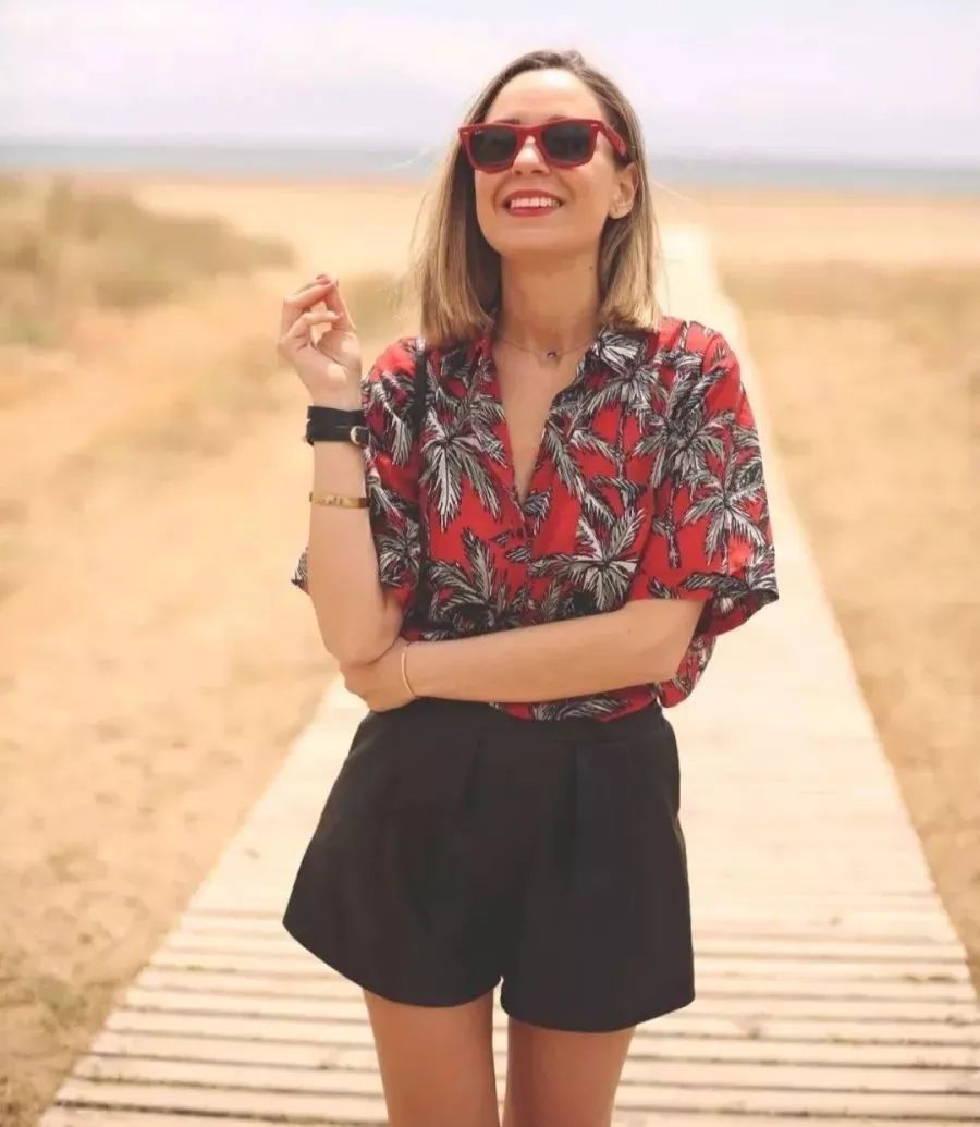 女孩子穿花衬衫,最经典的搭配就是把下摆全部塞进裤腰里,下半身搭配牛仔短裤或者锥形裤,再戴一副墨镜。