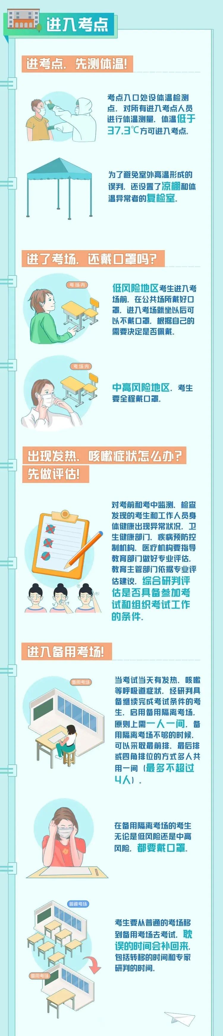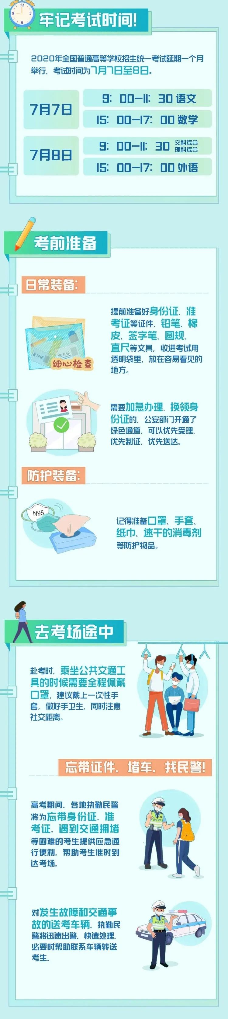 @考生:身份证、准考证,用结实的透明袋子装好,不要“藏”得过于隐蔽,以免忘了“藏”在哪里;坚持两点一线,考完及早回家,不要外出;从家到考场的途中,要戴好口罩;要遵守考试规则、诚信应考,听从监考安排。