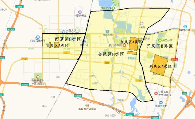 金凤区:包兰铁路以东、唐徕渠以西、沈阳路以南、六盘山路以北除A类区以外区域。