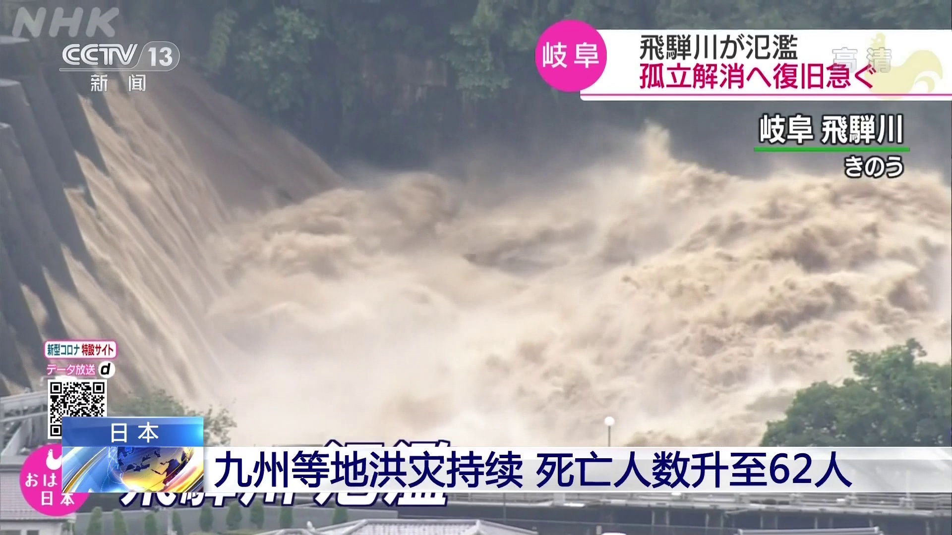 央视新闻7月9日消息,连日来,受强降雨影响的还有邻国日本。目前,日本九州地区因暴雨引发的洪水泛滥、山体滑坡造成的死亡人数升至62人,1人心肺功能停止,另有17人失踪。
