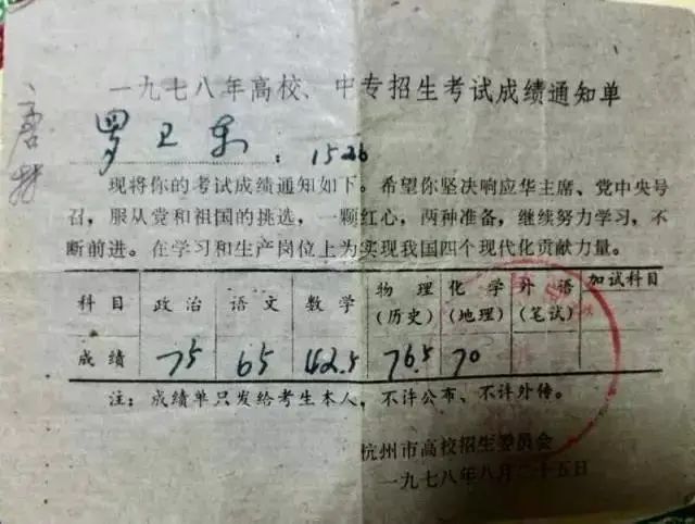 记得那是八月底的一个傍晚,集体劳动的村民已收工,有不少人在村边小溪里洗濯,有勤快些的,在自留地起劲地干活。太阳西沉,后山的影子不断在前山爬升,就快要到顶。炊烟已经开始升到村子的半空中,空气里飘着的是新米新面烹制的晚饭的香味,这是一个非常美好的夏天的黄昏。村里的赤脚医生徐玉培从公社回来,才到村口就气喘吁吁地高声叫着我父亲的名字,说有一份寄来自杭州的挂号信。此前村里也有参加高考的同学,陆陆续续地收到这样的挂号信,但都是名落孙山的消息,父亲怀着忐忑不安的心情,当场拆封,一看是杭州大学发来的高考成绩单和录取通知书,登时喜出望外,一块石头也就落地了。
