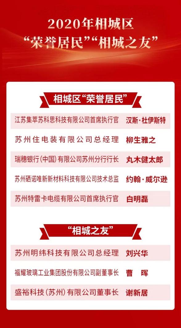 日前召开的2020年相城区人才工作大会上,相城区政府向对经济社会发展、对外交流合作作出突出贡献的境外人士,授予首批相城区“荣誉居民”“相城之友”称号。