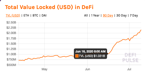 DefiPulse 数据显示,从 6 月 16 日至今不足一个月内,链上锁定加密资产总价值激增超过一倍,目前暂报 21.5 亿美元。