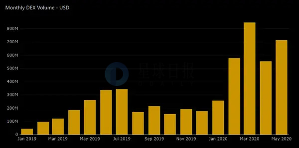 Dune Analytics 数据显示,今年前六个月以太坊上 Dex 交易量达到近 30 亿美元,而去年一整年才只有 24 亿美元。