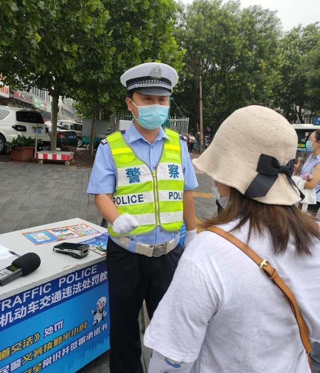 7时45分,在中华南大街西侧、新石南路南侧,一位女士骑电动车自南向北行驶。“您好,请您停一下。”敬完礼后,桥西交警大队民警说道:“您逆行了,请把电动车推到便道上来。”