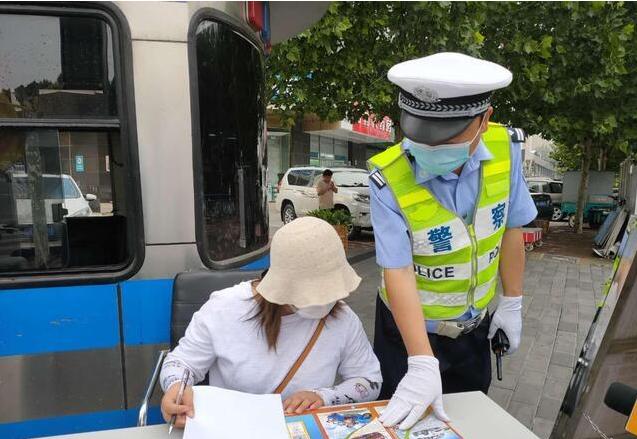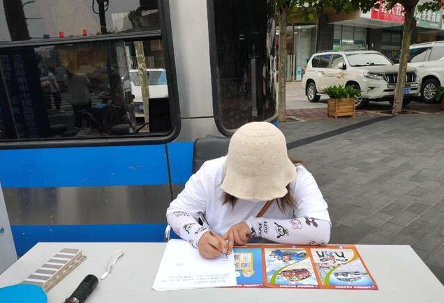 听完民警的介绍,女士选择了“抄写交通安全常识并签署承诺书”。随后,她坐在“行人、非机动车交通违法处罚教育点”的椅子上,拿起桌子上放着的宣传册,认真抄写起来,最后签上了自己的名字。