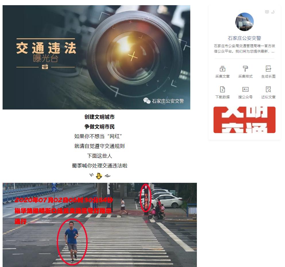 目前,市交管局在市区主要路口均安装了人脸识别系统,不间断抓拍行人、非机动车交通违法行为,并通过路口LED大屏、官方微信、微博对行人、非机动车交通违法进行持续公开曝光。