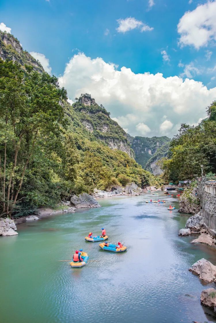 清溪峡漂流号称黔北第一漂,全长7.8km。沿途分布32个险滩,原生态的峡谷风光,水流湍急,舟行若飞的感觉让你难忘。