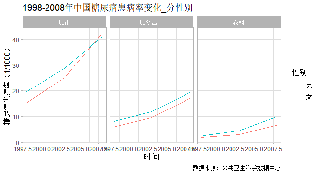 公共卫生科学数据中心收集整理了1998-2008年的四次国家卫生服务调查中糖尿病患病率数据,从性别、地区别、年龄别等多个维度对我国糖尿病患病率数据进行了整理(糖尿病患病率指调查地区35岁以上人口医生诊断的糖尿病患病率)。