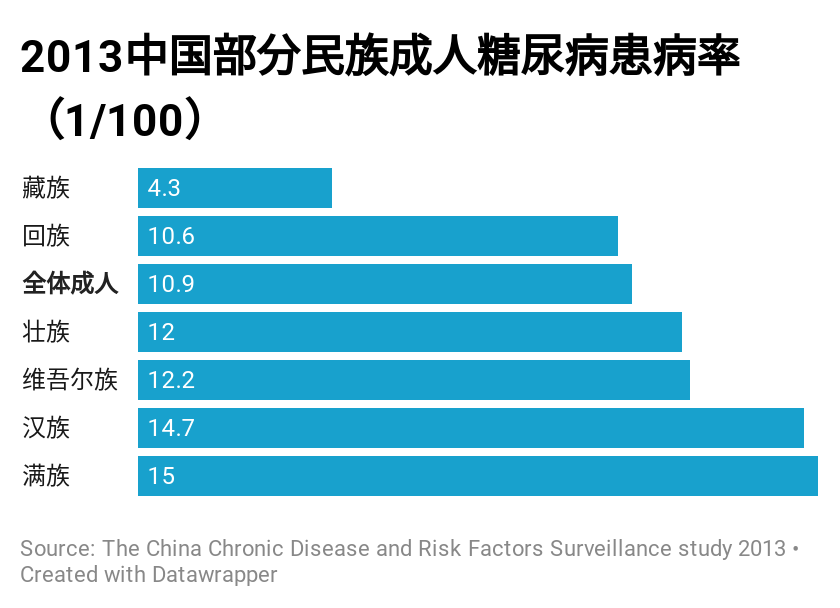 同时,我国境内不同民族人民之间的糖尿病发病率存在差异,据中国慢性病和风险因素调查研究(2013)数据显示:我国除满族外,主要少数民族群体的总糖尿病患病率较汉族低。