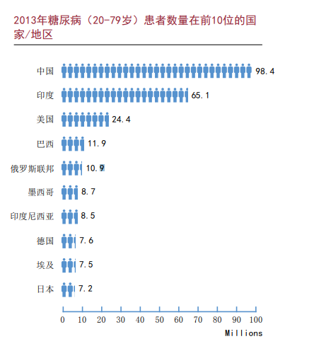 糖尿病的疾病负担非常庞大,在2013 年造成全球510万人死亡以及5480亿美金的医疗支出,占全球医疗总支出的11%。