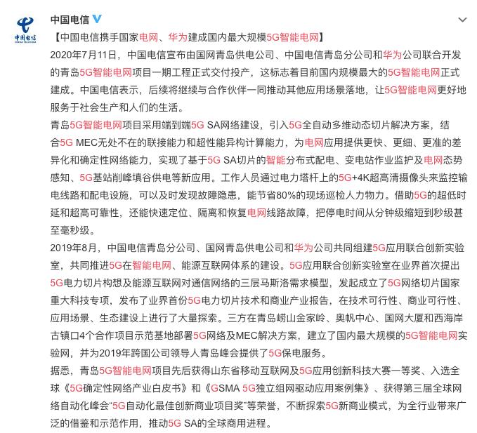 2020年7月11日,中国电信宣布由国网青岛供电公司、中国电信青岛分公司和华为公司。