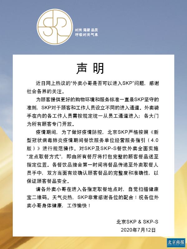 自媒体曹导的职业体验把北京SKP连续两日推上微博热搜。7月12日,北京SKP对于视频内提及的外卖人员不得进入商场内部作出回应。北京SKP表示,疫情期间,为了做好疫情防控,北京SKP及SKP-S的餐饮外卖全面实施“定点取餐方式”,即由所有餐厅将打包完整的顾客餐品送至指定位置。