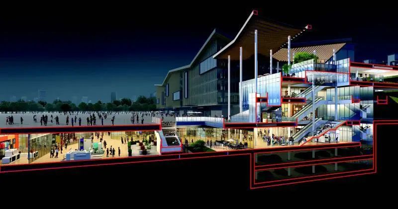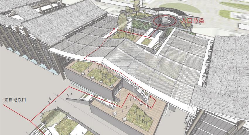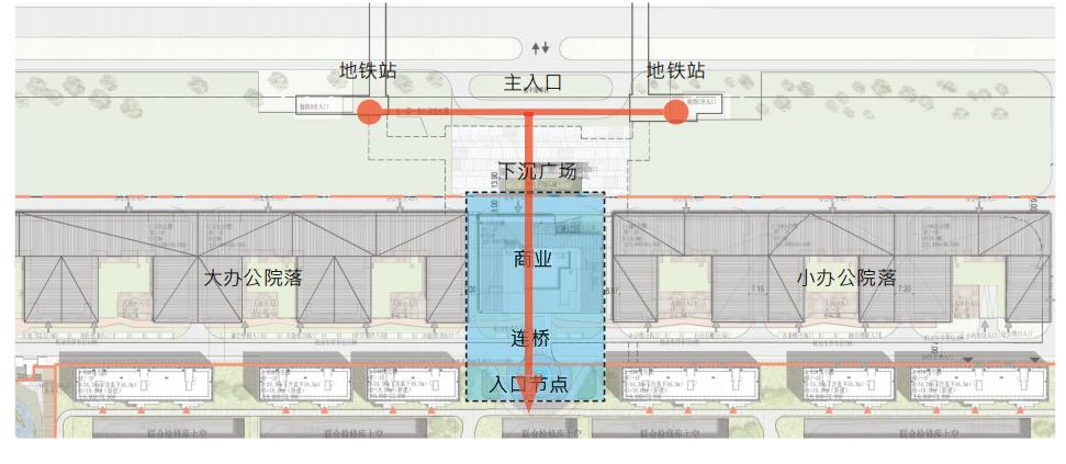 利用车辆段高差条件,引入下沉式花园;强化竖直方向交通,形成居住办公无缝衔接;地下连廊区域引入地下商业,完备的地铁站设施,将最大化满足通勤人员的需求。