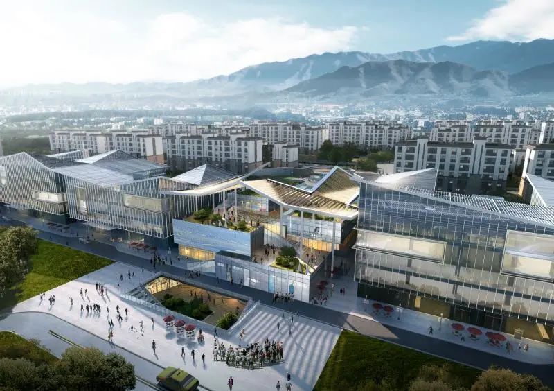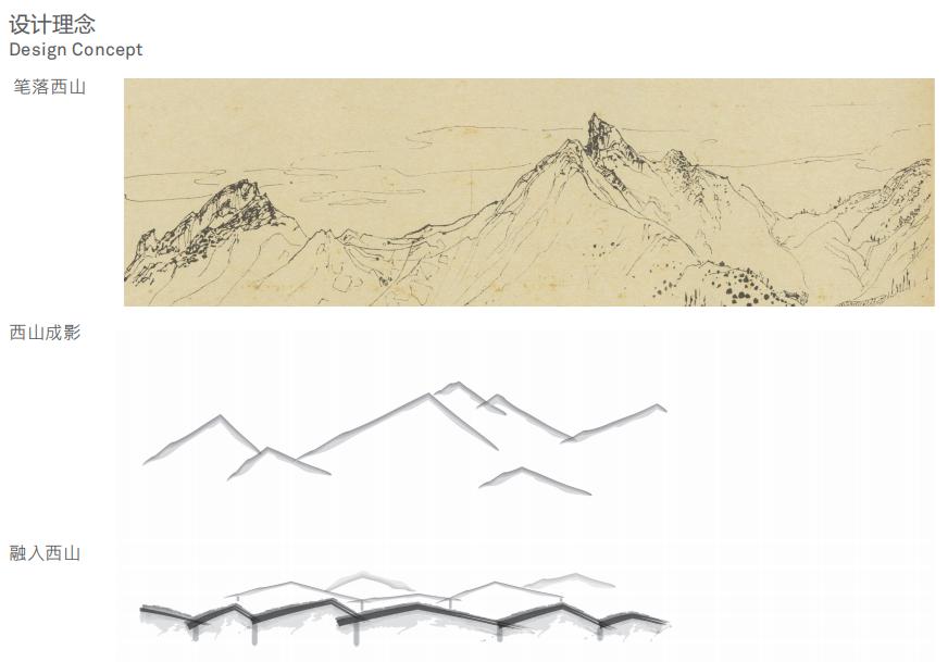 600米的北清路城市沿街主界面,形成城市天际线。建筑形态暗含西山层峦叠嶂的山峰形态,远处山峦和屋顶交相呼应。