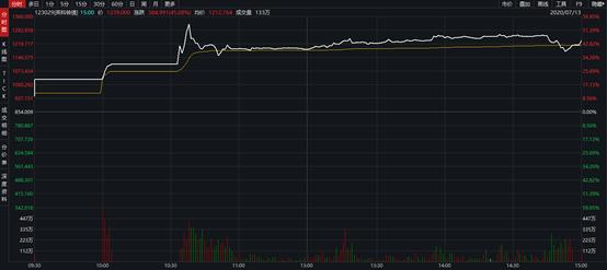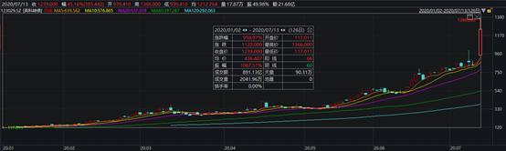 7月13日,英科转债再度走牛,开盘价格为939.41元,盘中两次临时停牌,最高涨至1366元,截至收盘上涨45.08%,达1239元,单价上涨近400元,成交量达1.79亿,成交金额21.68亿元。再次刷新了此前由它自己创下的1993年以来可转债史上最高价格。