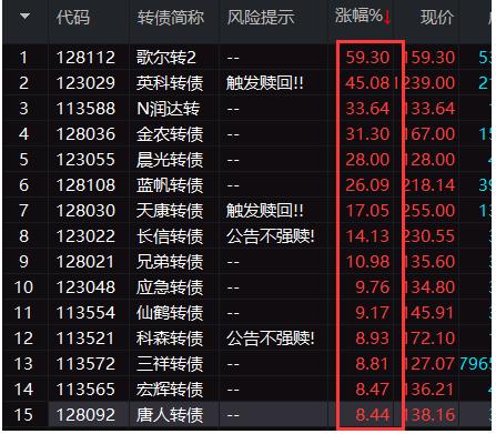 就在此前不久,已经有泰晶转债等启动强制赎回,引发价格大跌。而今天涨幅排名居前的转债品种中,已经有两只达到了触发赎回的标准。
