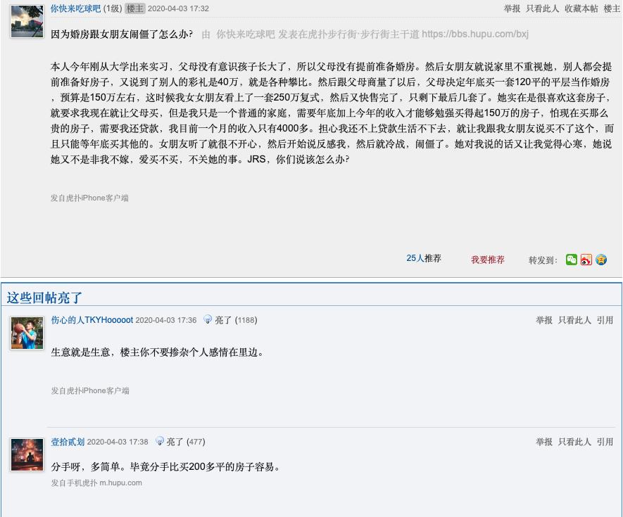 虎扑上一篇名为《因为婚房跟女朋友闹僵了怎么办?》的帖子中,楼主的女朋友向他索要一套价值250万元的婚房。最终男女双方因为婚房价格闹翻,楼主向网友求助是否应该答应女友的要求。