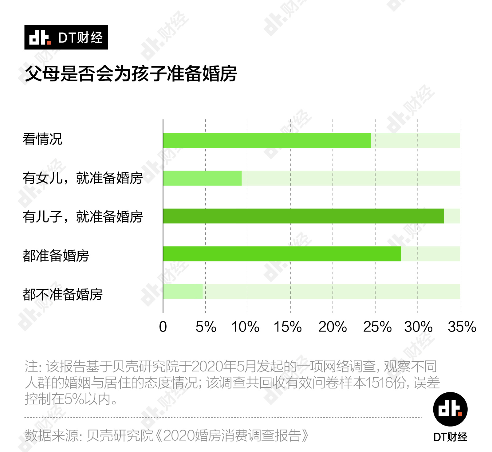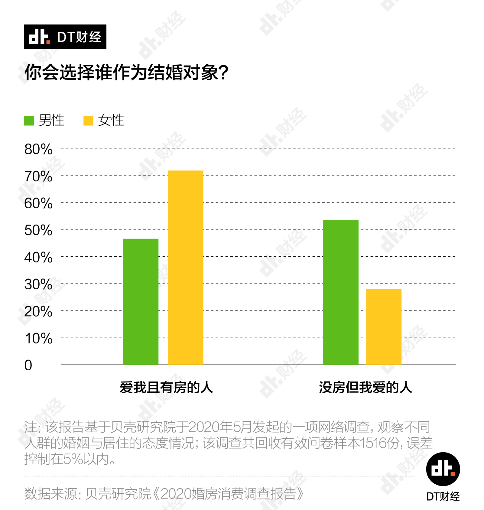 调查中的另一个问题也证明了这个观点——父母是否应该为孩子准备婚房?在给出肯定答案的受访者中,认为男方父母应该准备婚房的人是女方应准备婚房的3倍。