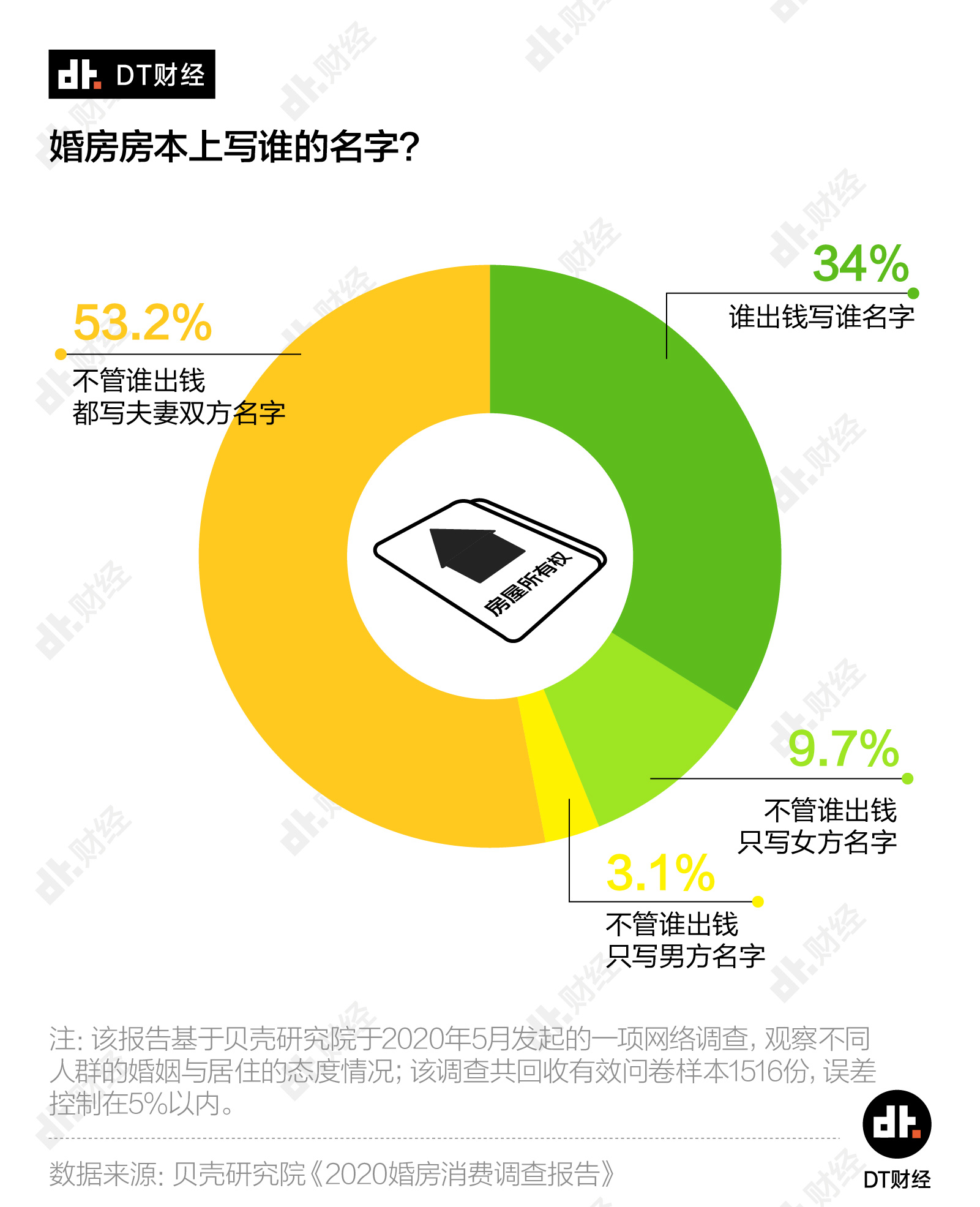 总体来看,超过半数人认为夫妻的名字都要写。有34%的人更理性地觉得,谁出钱就写谁的名字。