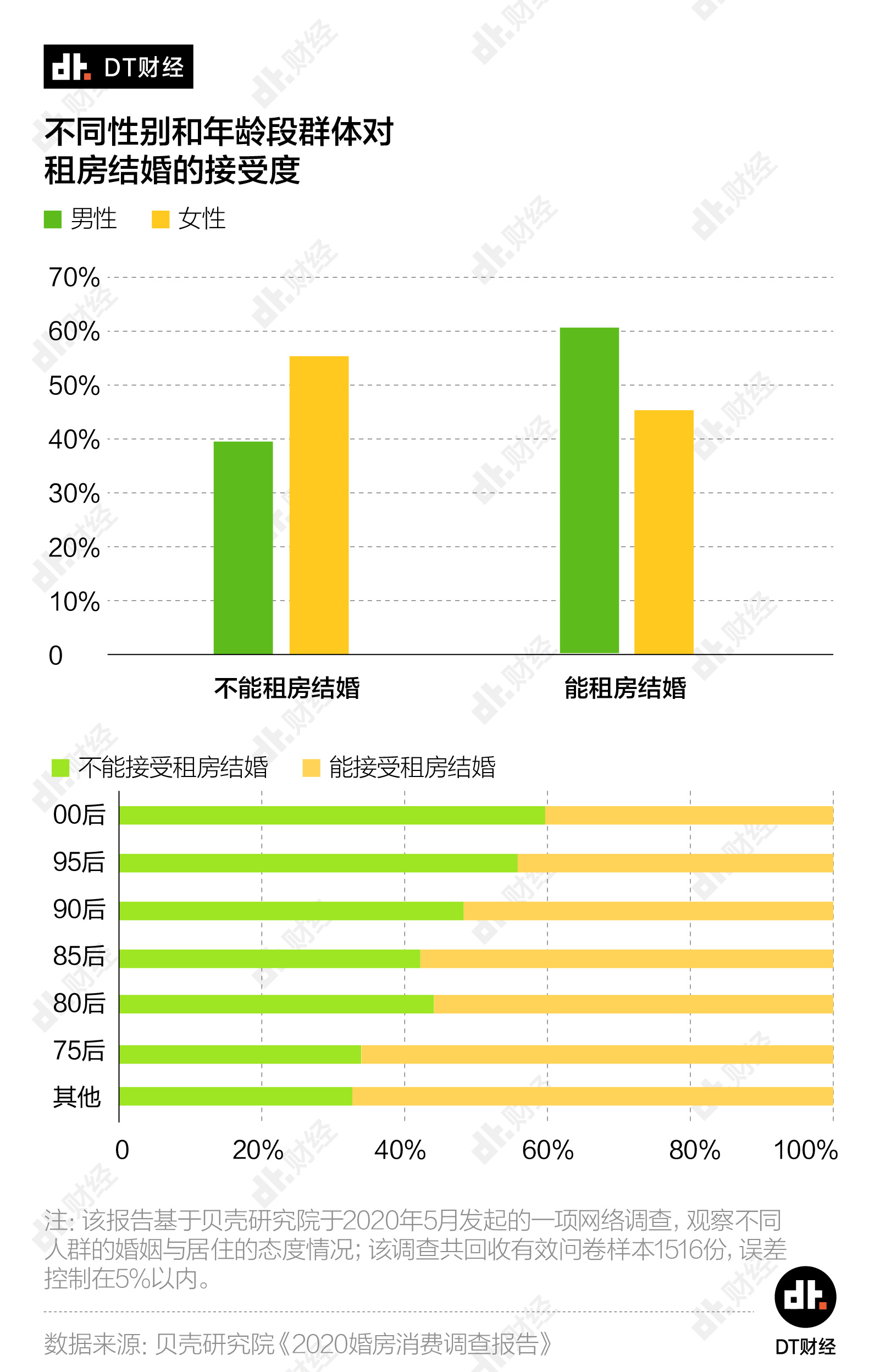 没有房子你还会结婚吗?调查显示,“租房结婚”和“无房不婚”的态度几乎各占一半。但以性别和年龄为区分,我们得到了一些有趣的结果。