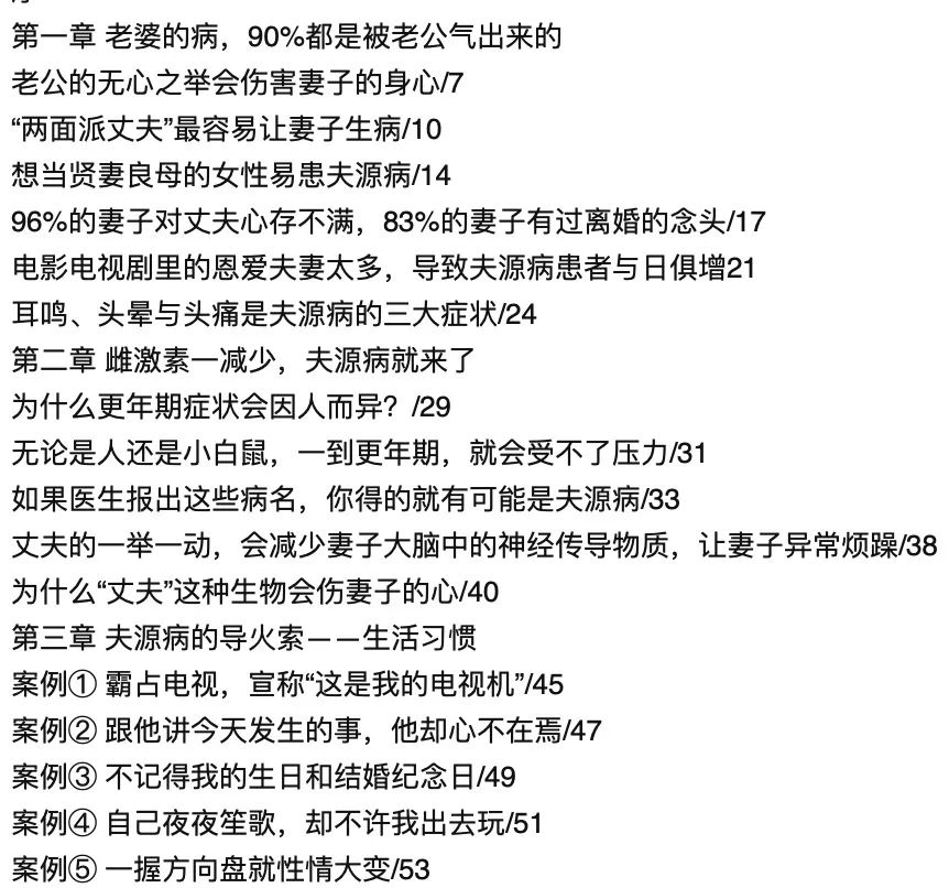 看起来似乎是夫妻生活中正常的情绪波动引起的不适,石藏文信认为这种“夫源病”的初期症状很像亚健康状况,或者更年期综合症,因此误诊的机率很大,他还总结出了可能导致妻子患上“夫源病”的丈夫十大言行举止表现。