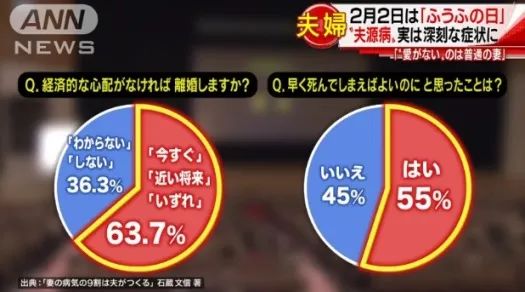 石藏文信的研究中还显示,56%的妻子,在结婚5年以内开始对丈夫不满。在“如果不考虑经济问题,是否会考虑离婚”的调查问题中,63.7%的妻子回答“马上就想”、“最近会想”、“迟早会想”,还有55%的人曾有过这样的想法:“要是(丈夫)早点去世就好了”。