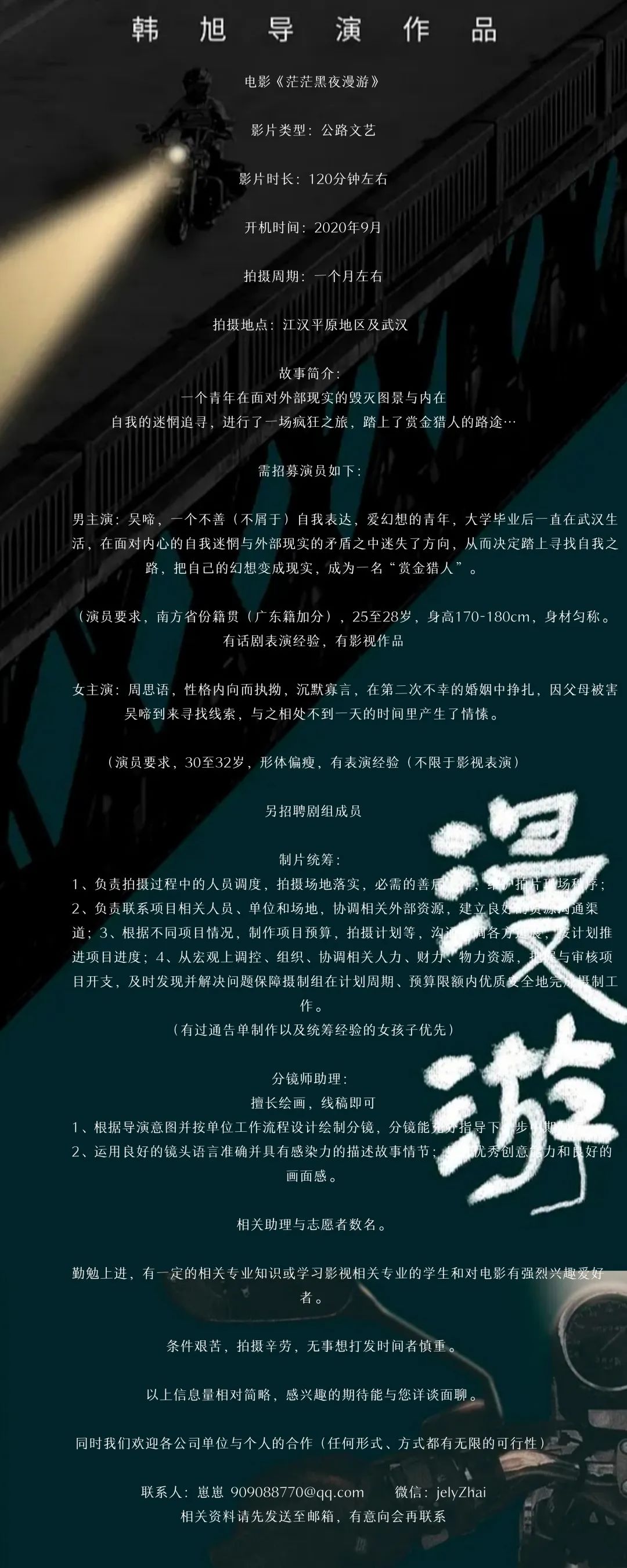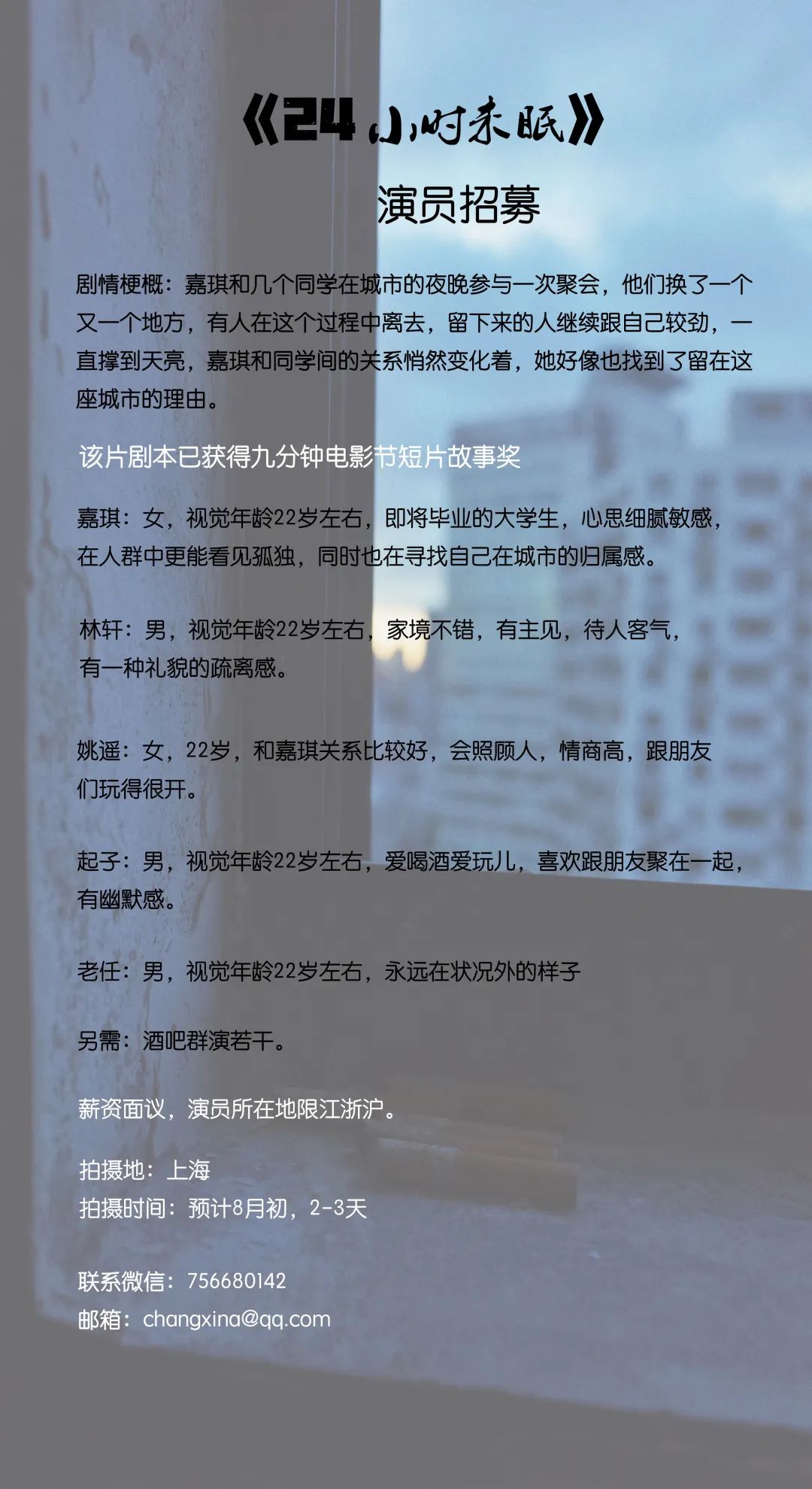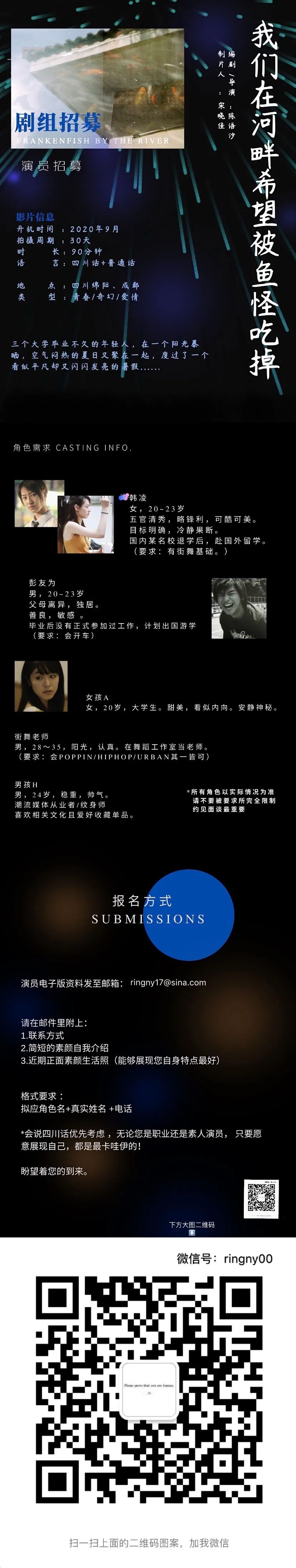 邮件标题/微信申请提示“演员角色/剧组岗位+真实姓名”,请发送个人简历,照片(演员),作品集至联系人,欢迎无表演经验的朋友前来尝试。