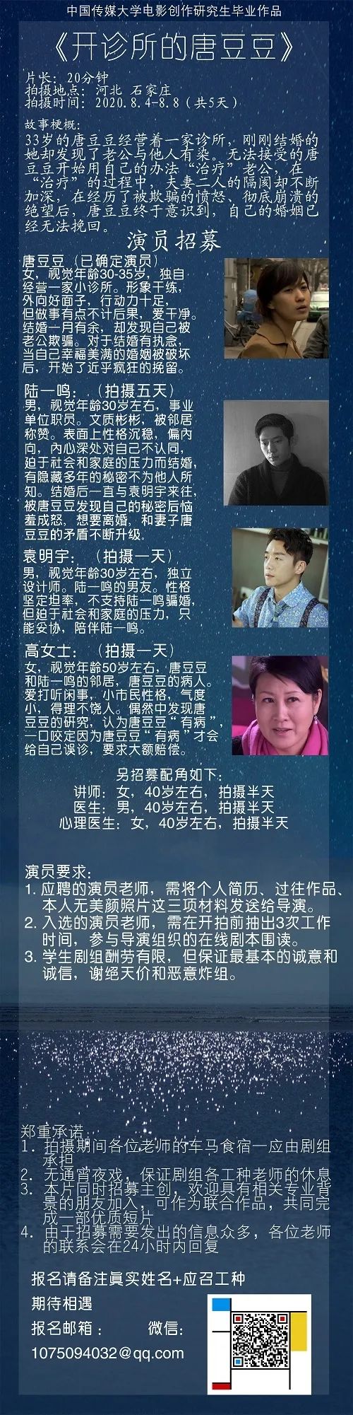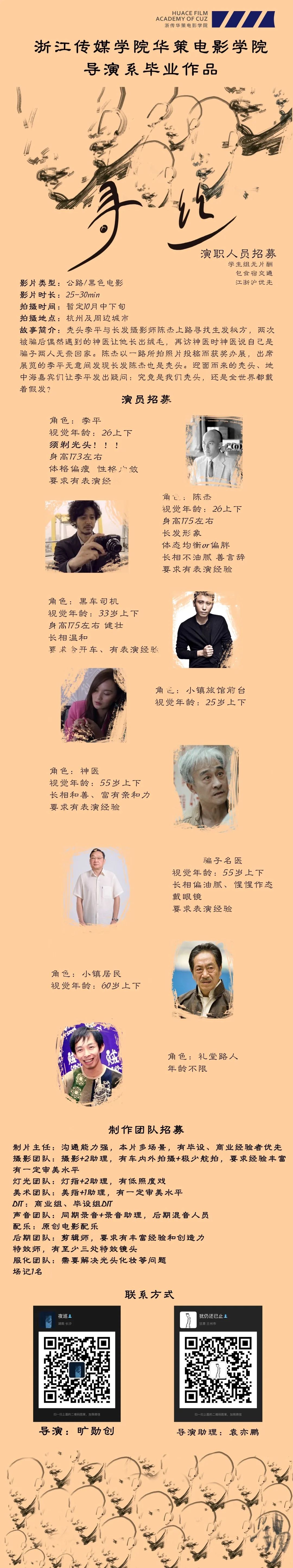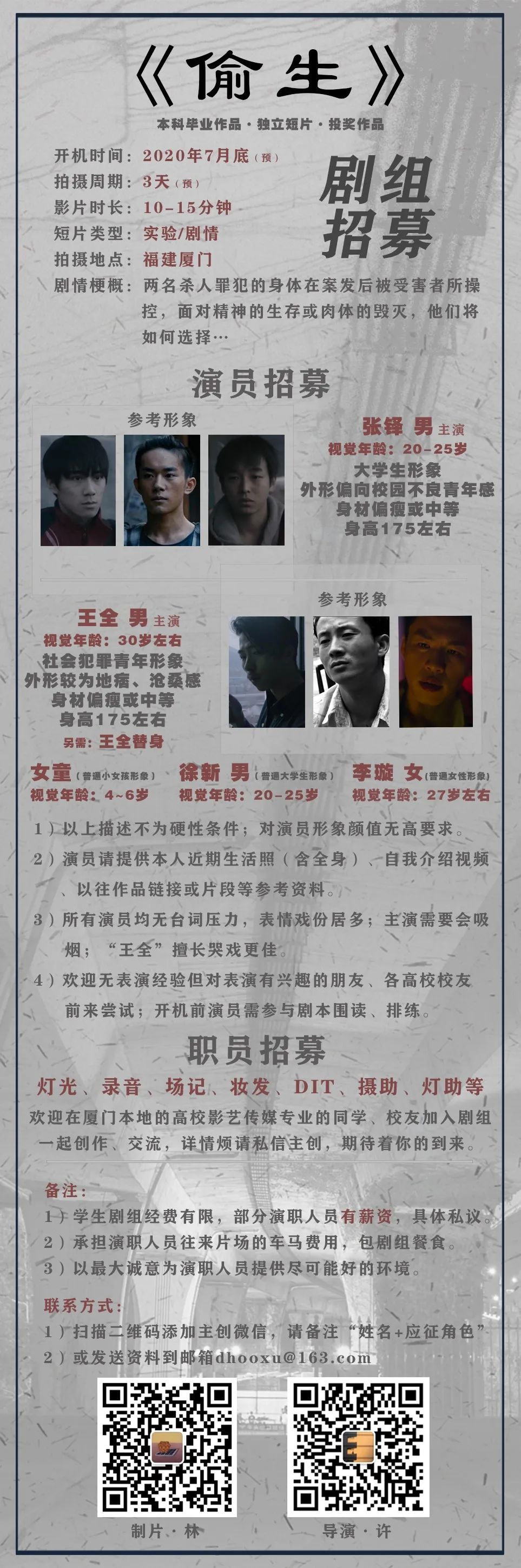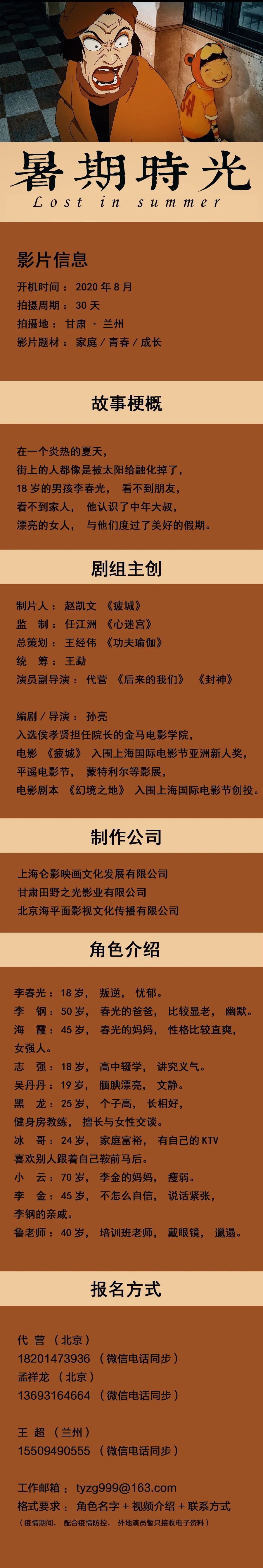 邮件标题/微信申请提示“演员角色/剧组岗位+真实姓名”,请发送个人简历,照片(演员),作品集至联系人,欢迎无表演经验的朋友前来尝试。