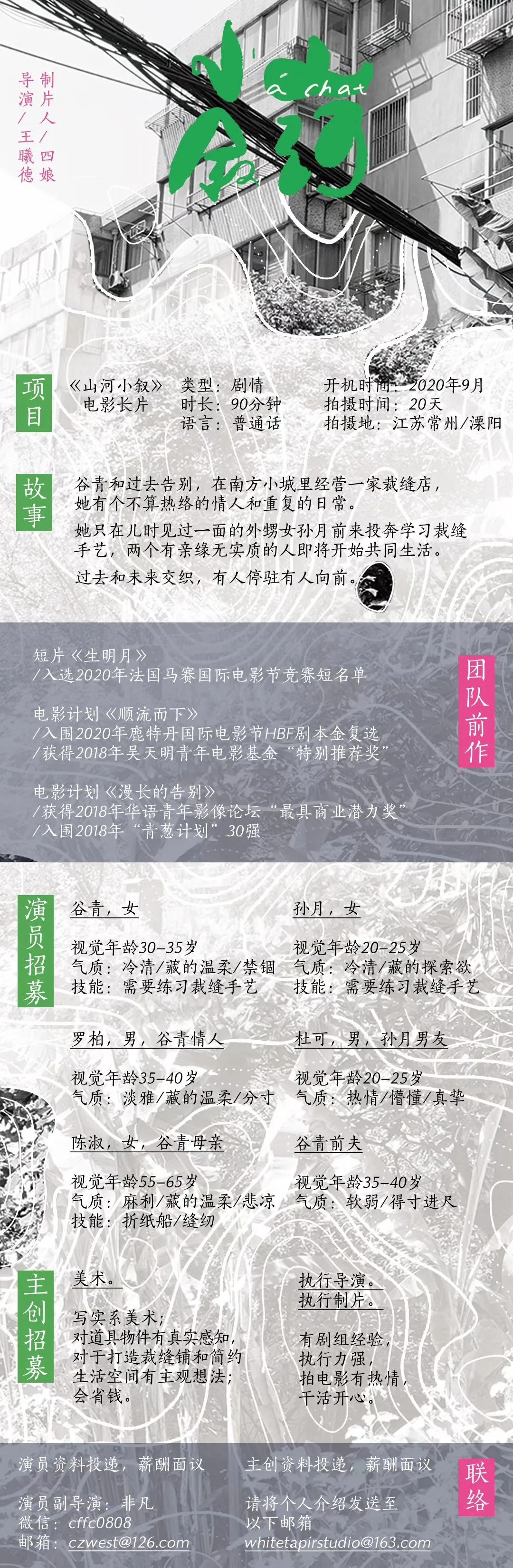 邮件标题/微信申请提示“演员角色/剧组岗位+真实姓名”请发送个人简历,照片(演员),作品集至联系人。