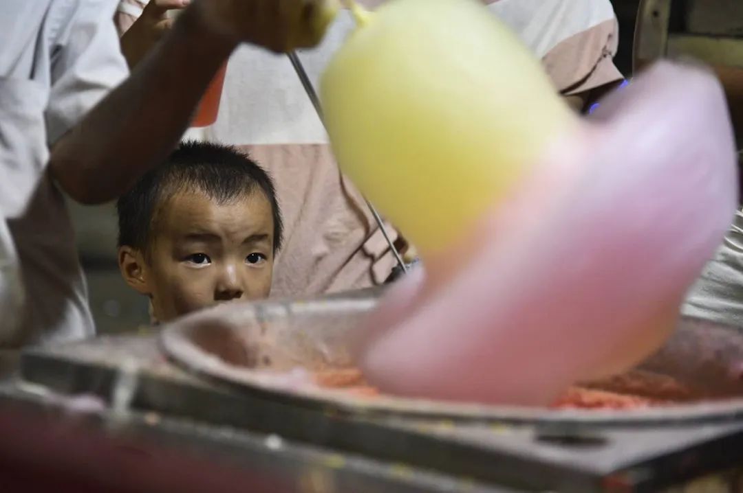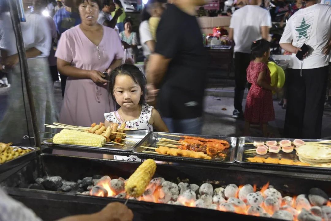 待夜幕完全拉开,伴随着眼前的一片热闹繁华,席地而坐的情侣呢喃着情话,交换着幸福的心事;带着孙辈嬉戏的老头老太太,一会儿逗留于草地,一会儿辗转于烧烤摊玩具摊;衣着靓丽的姑娘小伙端坐村口广场一角,精心看守着自家小摊,灯光闪烁里,他们年轻的容颜越发青春活力。其间,一妆容精致的少妇携带幼女,仔细看护着自家玩具摊,见有人打量她家玩具,便耐心上前询问给示范介绍。问及一天能挣多少钱时,羞涩的她摸摸头笑着说:“挣得不多,想多体验体验,先积累点经验。”眼神里满是憧憬。