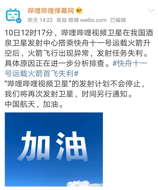 7月10日,快舟十一号运载火箭发射失利,B站送给大家的“儿童节礼物”——“哔哩哔哩视频卫星”——也因此没能进入轨道。