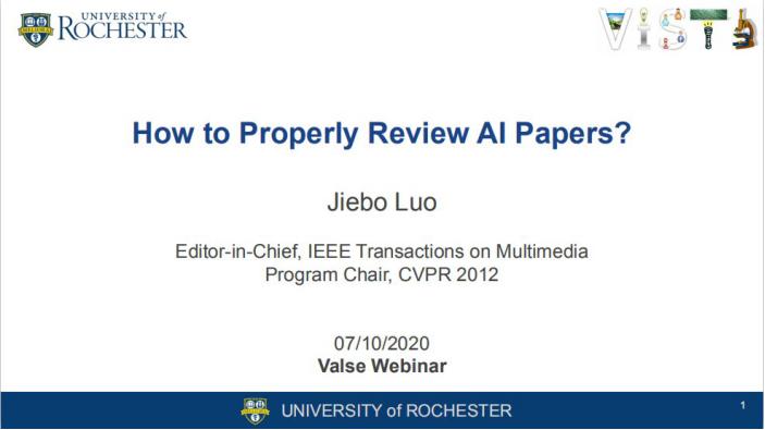 在近期举办的视觉与学习青年学者研讨会(VALSE Webinar)上,IEEE 多媒体汇刊 TMM 总编、CVPR 2012 程序委员会主席、美国罗切斯特大学计算机科学系教授罗杰波分享了《如何做一个 AI 领域审稿人》的主题报告。