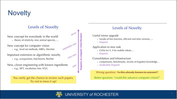 所以,正确意义上的创新按降序应包括:其他研究者未曾提过的新问题、已知问题的新的技术解决方案、更好的分析和理解、以及更佳的实验结果等。