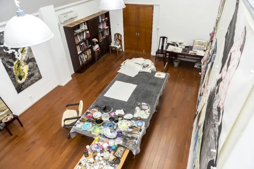 走进工作室之时,几乎占据大半空间的画案上,一本打开的任伯年画册压着被“梁缨化”的紫藤。墙上贴满了将形象放大十倍甚至百倍的水墨画,梁缨说,还没画完,不好意思拿出来给人看。工作室内东西很多,却也井井有条,夹层作为会客区域,茶台上放了很多零食,如果不是受疫情影响访客减少,这些零食估计早已进入朋友们的腹中。疫情期间,梁缨保持了非常规律的作息,除了中午陪母亲吃饭,其余时间基本都在工作室,疫情最严重时偌大的炎黄艺术馆只有她和门口的保安两个人,这段时间也成为梁缨口中的“高产期”。