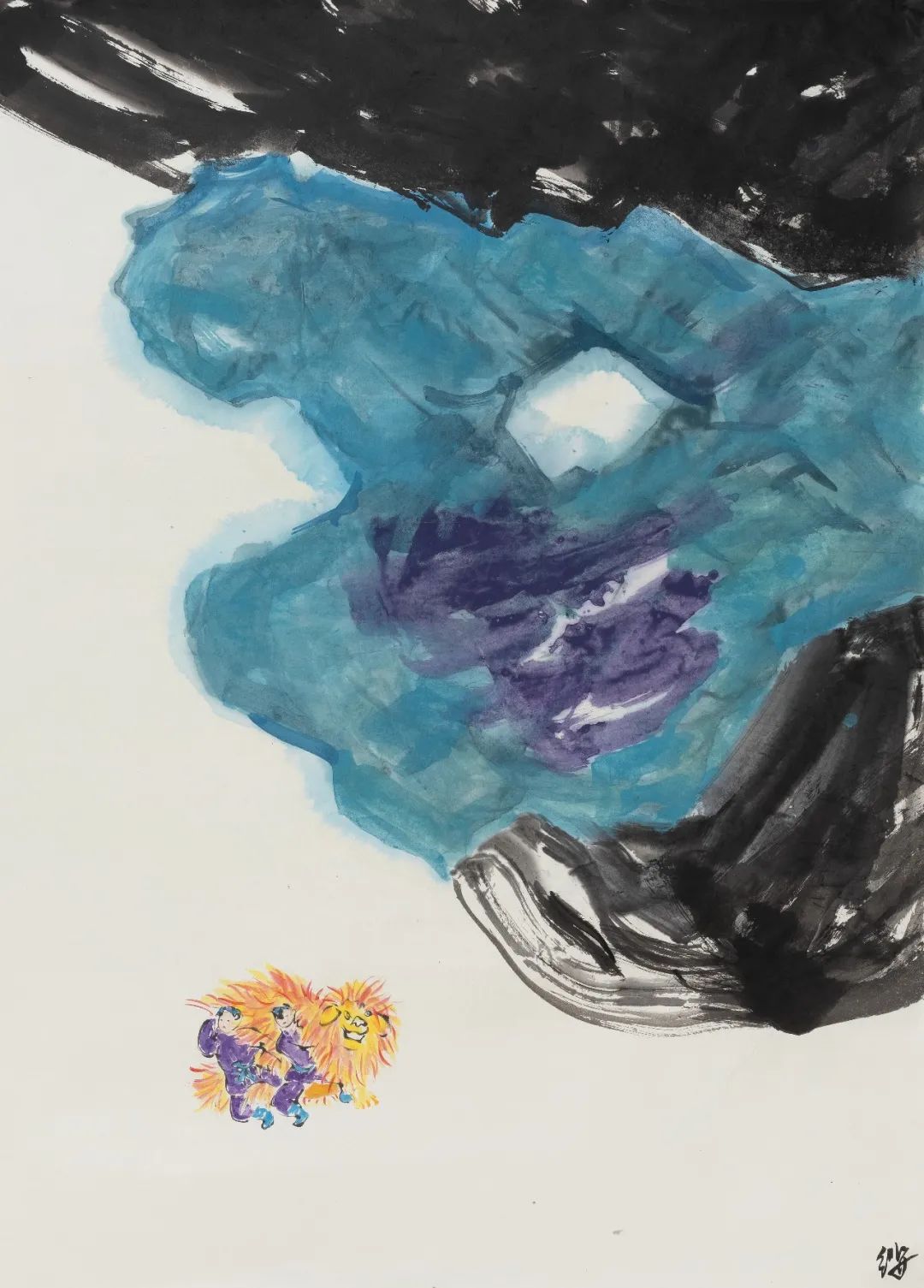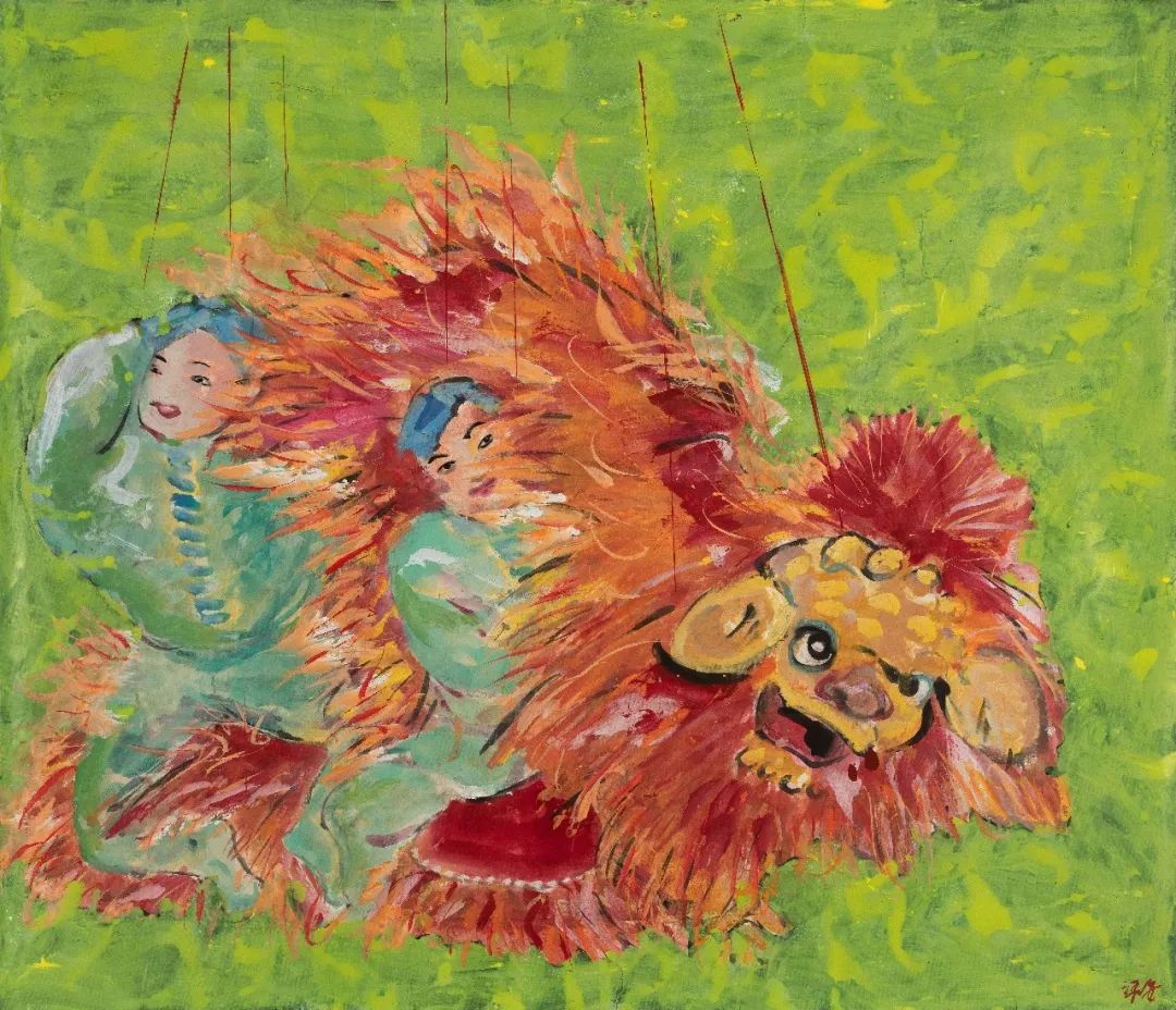 展览同名作品《金毛狮,一张皮》,源自偶然电视上看到的木偶戏《舞狮》,当脱下狮皮那一刻,两个木偶娃娃的头便从底下露了出来。这一幕,被梁缨多次定格在宣纸之上。2019年创作的《金毛狮,一张皮》色彩极具张力,表情丰富,放大的狮子和两个人偶居于画面中央,红色的悬丝从天而降,控制着画面的走向。