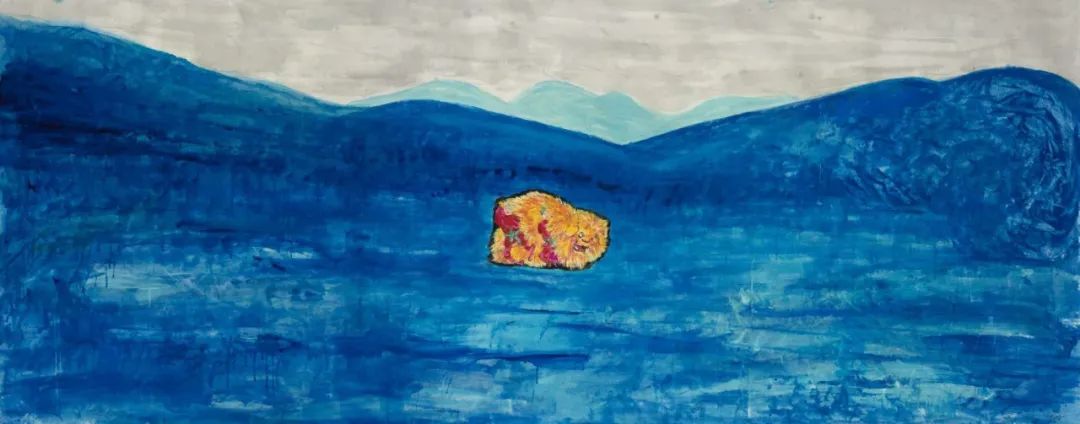 同一时期,梁缨就这一题材,进行了很多不同的尝试。2018年的《戏金毛》用了同样的狮子和人偶,只是偏居一隅且没有悬丝,巨大的山石从画面右上方像一只巨手压迫而至;2019年创作的另一幅同类题材作品《孤独舞台》长达3.63米,偌大的画面由一片蓝色构成的山水铺陈,狮子和人偶缩于画面中央。在这些对于点线面结构锲而不舍的尝试中,正是一位艺术家对于石涛“我自用我法”的当代实践。