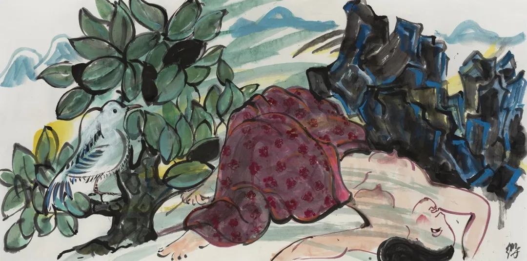 2015年的“南北东西得自由”个展中,首次集中呈现梁缨对于树木的绘画实践;2018年创作的《青绿山,洞中仙》开启了她对中国山水画的探索,并持续至今;2019年的《你把我灌醉》则是把中国传统的山石画法和当代自由女性形象融合在一起。