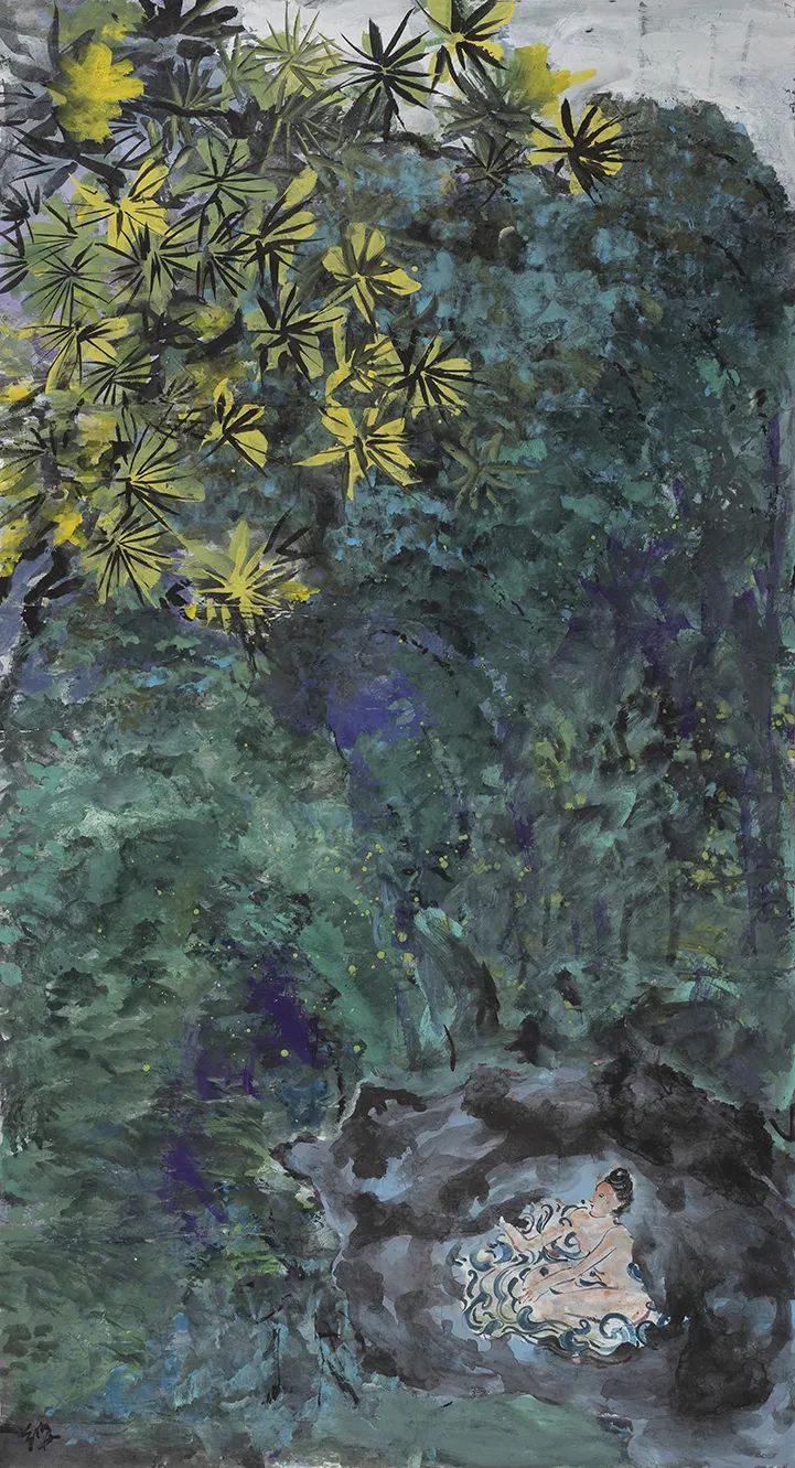进入新世纪,回到中国的梁缨出现了两个转折,一是她可以画大画了,二是开启了第二次万里写生——第一次是与父亲同行。重游少时走过的新疆、西藏、甘肃和江浙等地,则有了不同的心境。2018年《金蟾入太虚》《龙蛇惊天地》《谁来伴水仙》等大尺幅作品,可以清晰看到梁缨取材于古美术,却又加入了很多自己的思考和幽默。仔细观察画面细节,无论是踩高跷,还是悬丝,亦或是躲在山石后的一双眼睛,都带着女人面对世界是独有的不安与敏感。