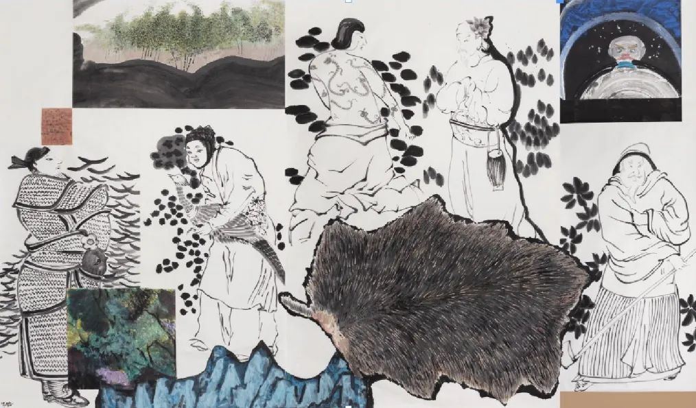 此次苏州博物馆现代厅的最深处,挂着一幅高2.82米,长4.75米的作品《纵然生得好皮囊,腹中原来草莽》,这是梁缨迄今为止最大的作品。画中人物取材于陈洪绶的《水浒叶子》,这是陈洪绶28岁时,为生活困顿的朋友创作的40幅水浒人物画,后来收藏家将其刻板印刷。偶然看到这本册子,竟然激起了梁缨极大的兴趣,她将人物画成真人大小,将此前画中的部分场景裁出来贴在宣纸上,因此,人物中穿插了很多景观:踩在脚下的高山、铺在人物之间的熊毯、悬在空中的竹林,甚至还有一个“外星人”在看着这个梁缨构建的世界。