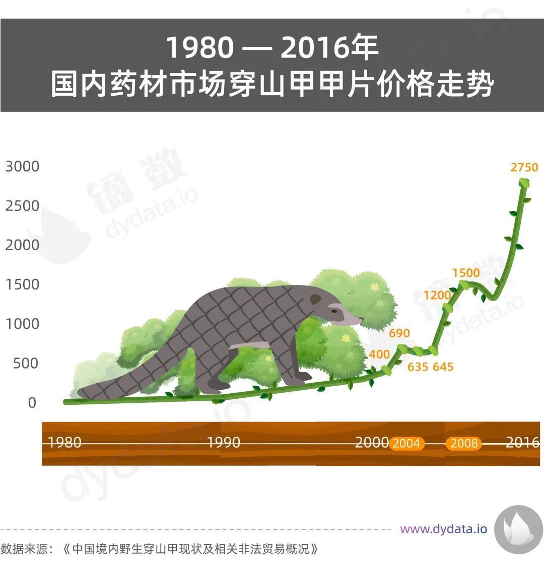 但导致穿山甲数量急剧下降的最为重要的原因还是源于人类的捕杀。作为最大的穿山甲鳞片消耗国,几十年间,中国穿山甲鳞片价格暴涨,已由1980年10元/kg上涨至2016年的2750元/kg,翻了275倍。