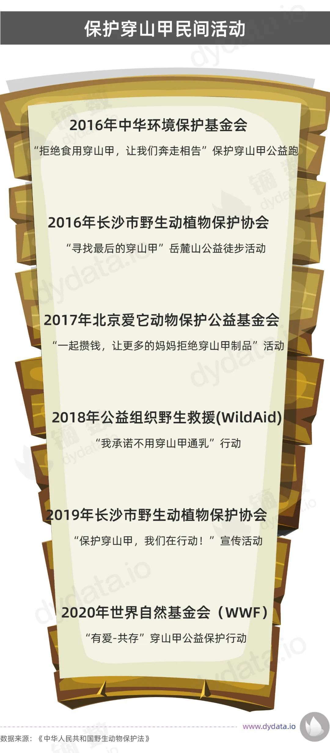 而对穿山甲的民间保护也是从未停止,包括中华环保基金会、长沙野生动物保护协会等等在内的很多机构都在为保护穿山甲奔走呼吁,他们联合政府、企业、明星,展开了各种公益活动,并且邀请普通大众来共同参与到穿山甲的保护工作中来。