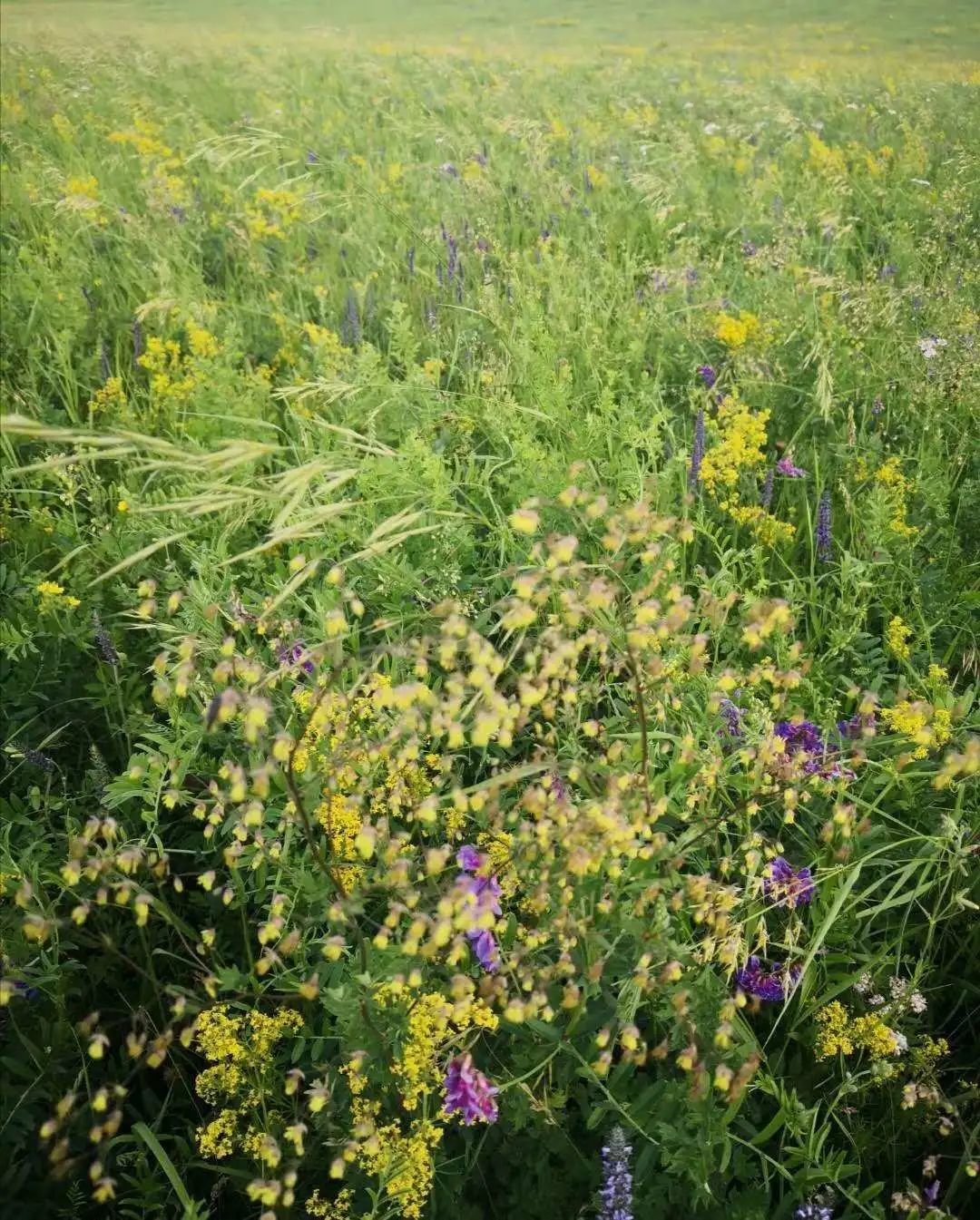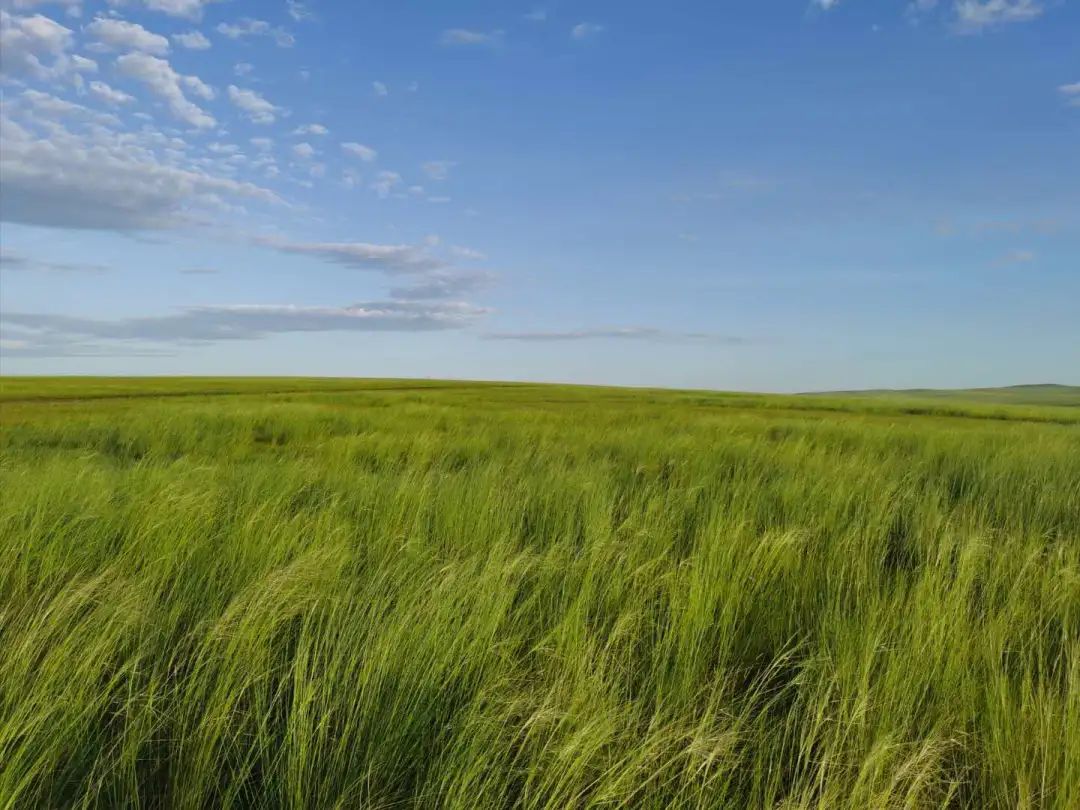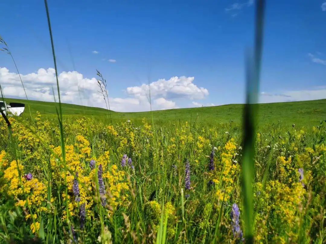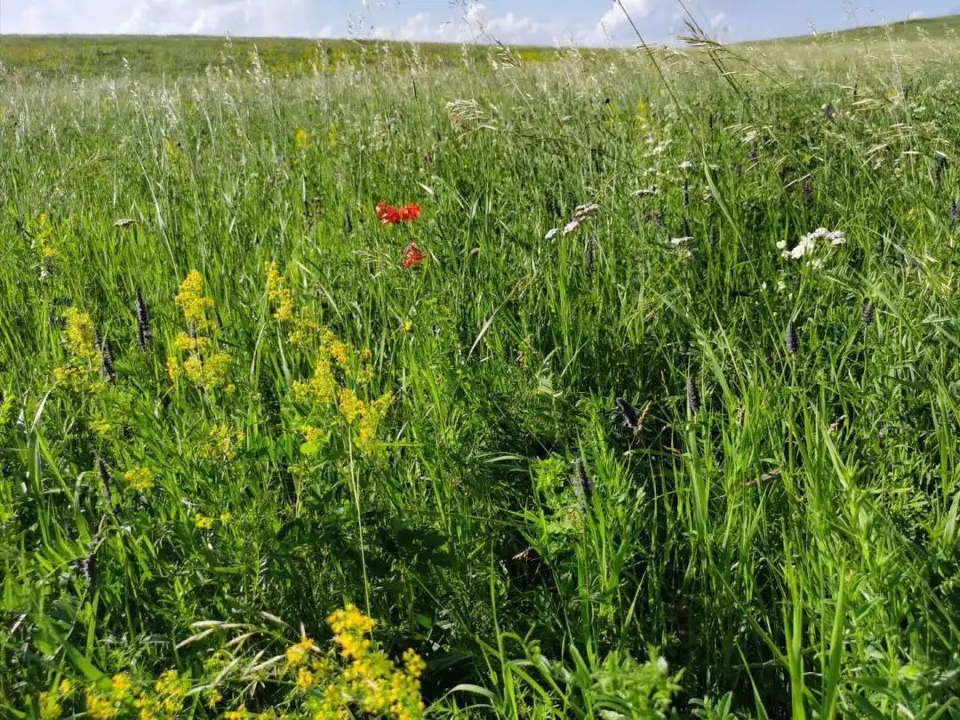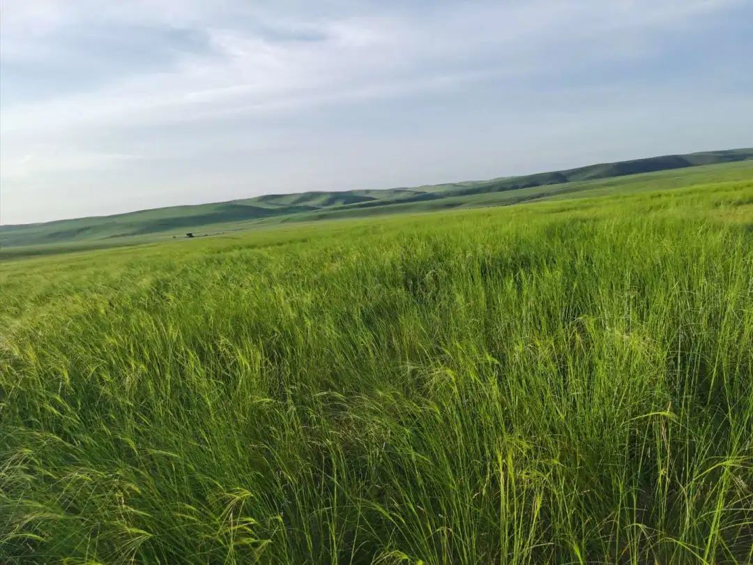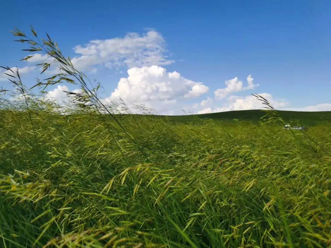 在表弟的引领下,我和朋友们来到了一大片草场。表弟说今年雨水好,草也特好。车从草原小路驶过,路旁的牧草淹没了车轱辘。
