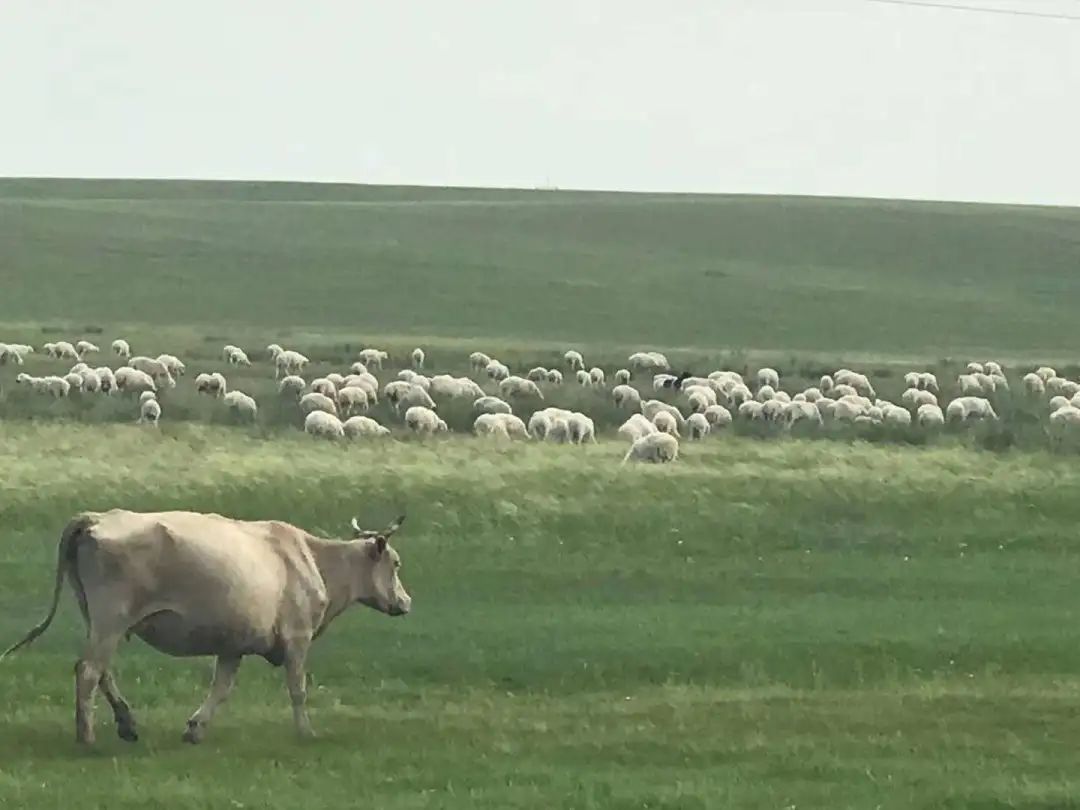 从旗里到表弟家是一条平坦的柏油路,犹如一条黑色的缎带,铺展在碧绿的草原上……车窗外满眼的绿连绵起伏,不时的有成群的牛羊从眼前掠过。一个多小时后,我和朋友终于到达了表弟家的牧场……